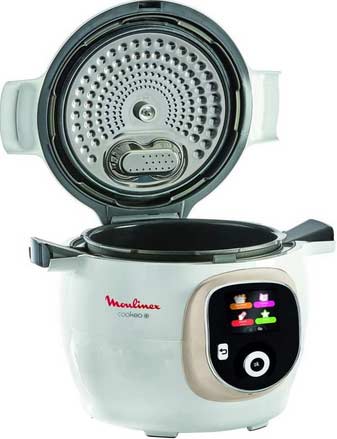- Le Cookeo + Connect dispose de 200 recettes embarquées. Ce modèle Moulinex qui bénéficient des mêmes caractéristiques techniques que l’appareil précédent se connecte sans fil à Internet à l’aide de la technologie Bluetooth. De ce fait, ses utilisateurs accèdent aux innombrables recettes disponibles sur l’application : « Mon Cookeo ».